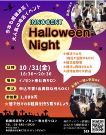 一般参加可能なハロウィンナイトもぜひお気軽にお越しください。イノセントのカウンセラーや会員と婚活トークで盛り上がりましょう。